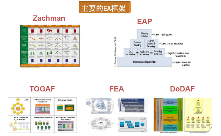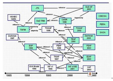 源于90年代美国的企业架构框架,到目前已经衍生出多种企业架构框架,如DoDAF(美国国防部体系架构框架 The Department of Defense Architecture Framework)、TOGAF等。