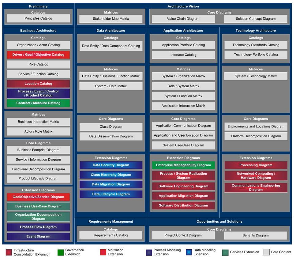 - TOGAF架构内容框架:提供了一个详细的架构工件模型,包括交付物、交付物的工件和架构构建块