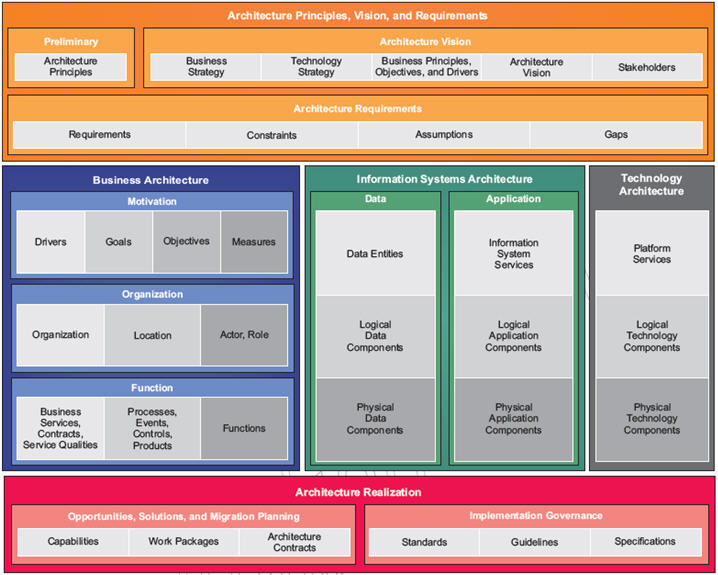 - TOGAF能力框架:一套资源、指导、模板、背景信息等等,帮助在组织中进行架构实践
