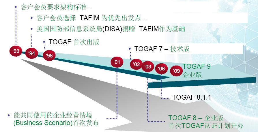 The Open Group于1993年开始应客户要求制定系统架构的标准,在1995年发表The Open GroupArchitectureFramework (TOGAF) 架构框架。TOGAF的基础是美国国防部的信息管理技术架构(TechnicalArchitecturefor Information Management:TAFIM)。它是基于一个迭代(Iterative)的过程模型,支持最佳实践和一套可重用的现有架构资产。它可让您设计、评估、并建立组织的正确架构。