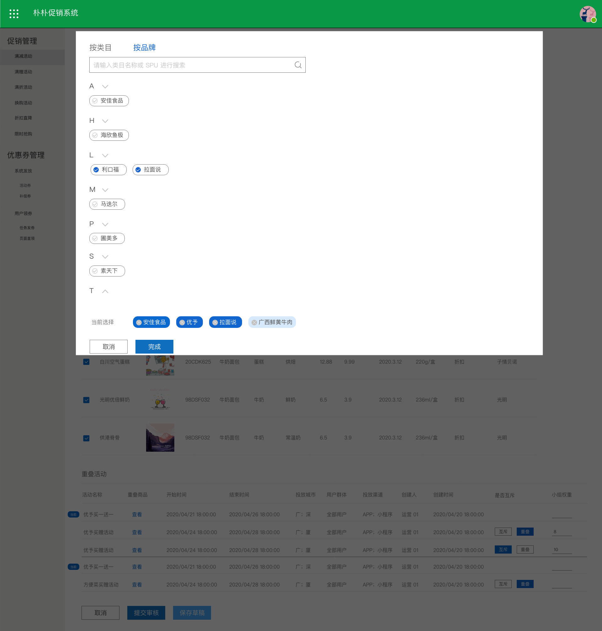 新建满减活动 – 每满减 – 选择商品 – 按品牌 – 品牌商品