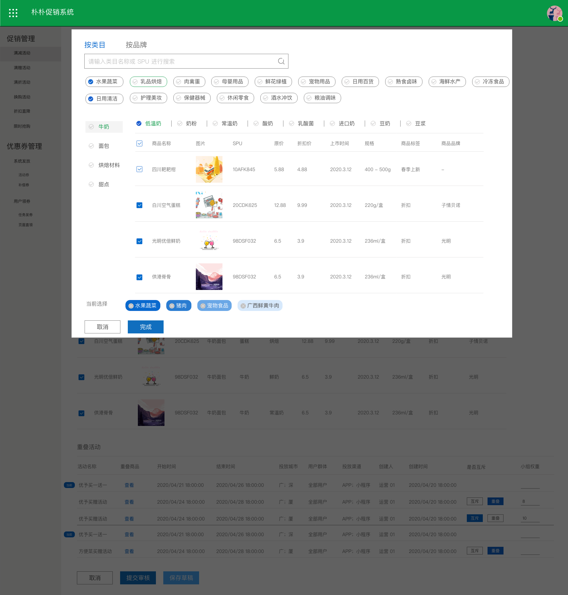 考虑到商品库内 SPU 众多,直接展示商品列表会增加对服务器的压力和降低响应速度,所以采用按类目、按品牌展示的两种维度方式,也是因为做活动时通常也是以这两种维度来考虑的,在这个页面可以选择到 1 – 3 级类目和单品商品。同时也可以直接搜索 SPU 进行定位。