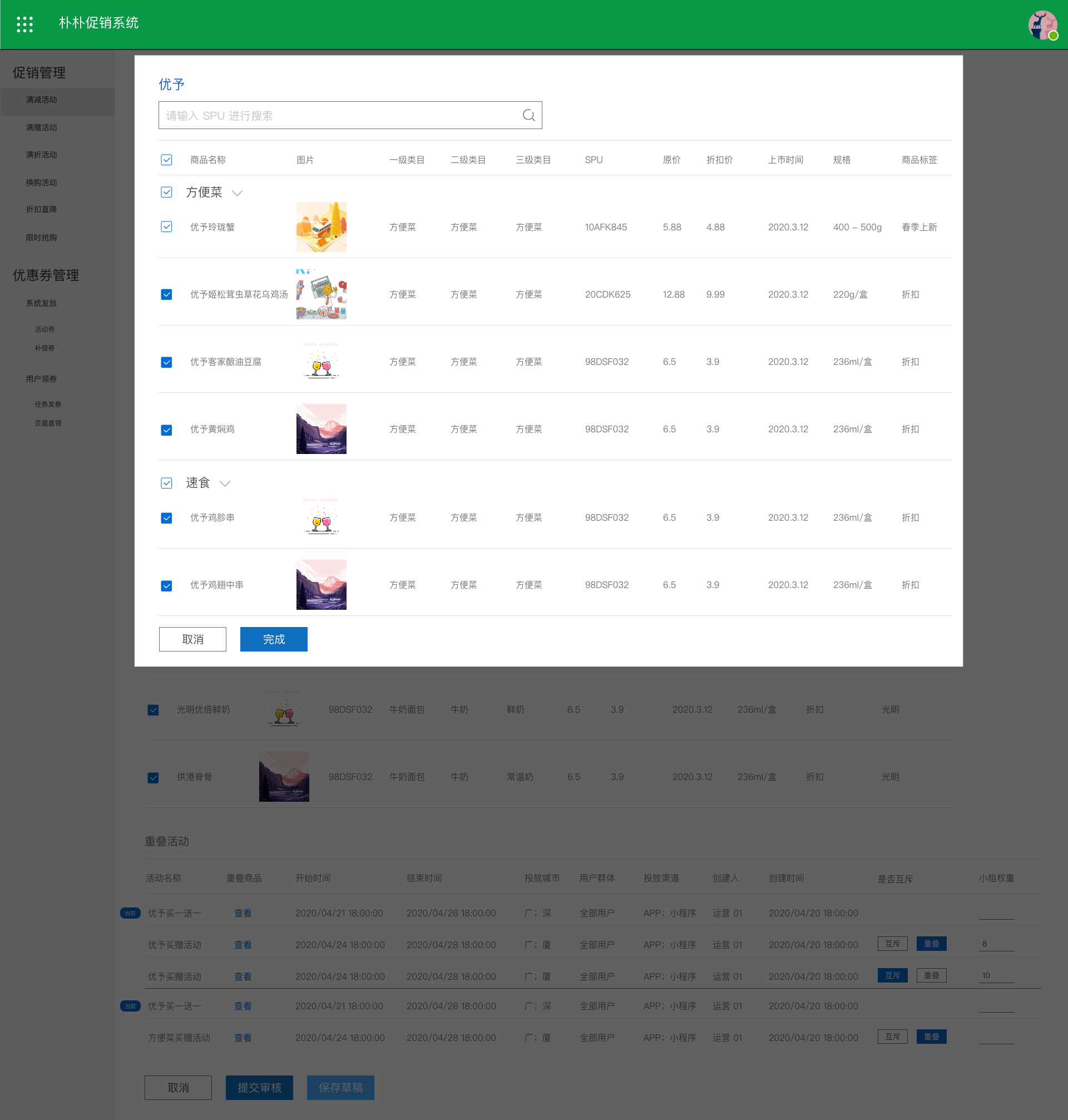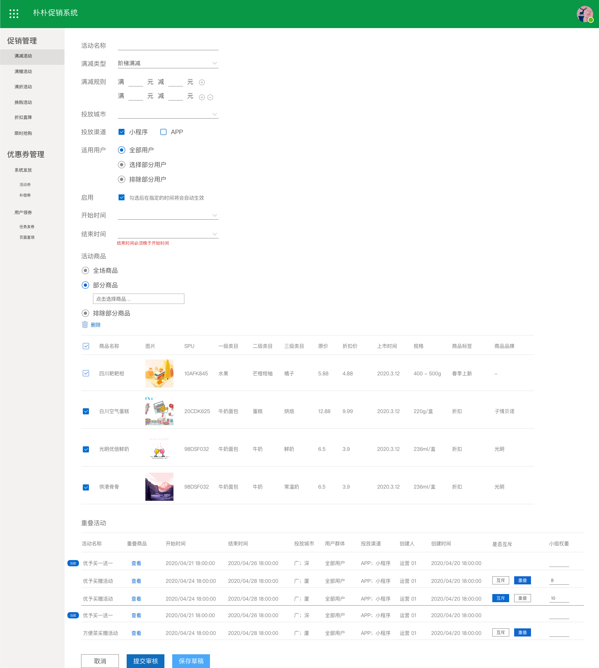这里贴出以满减为例的几张原型,包括列表页,新建活动页,和搜索选择商品的页面。