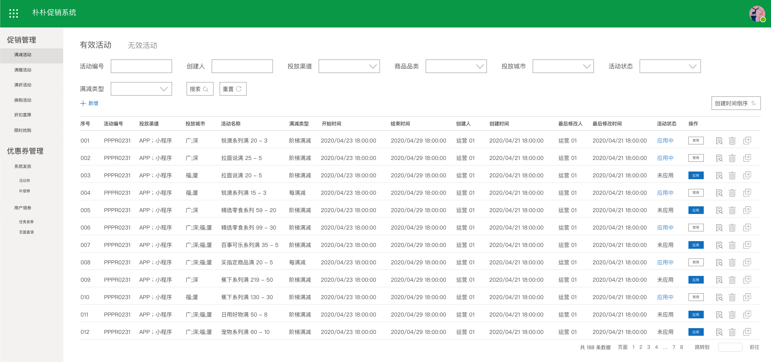 有效活动指在配置时已经设定生效并且通过审核的活动,可能正在应用或者还未到生效时间,无效活动则是草稿、待审核、已结束的活动。