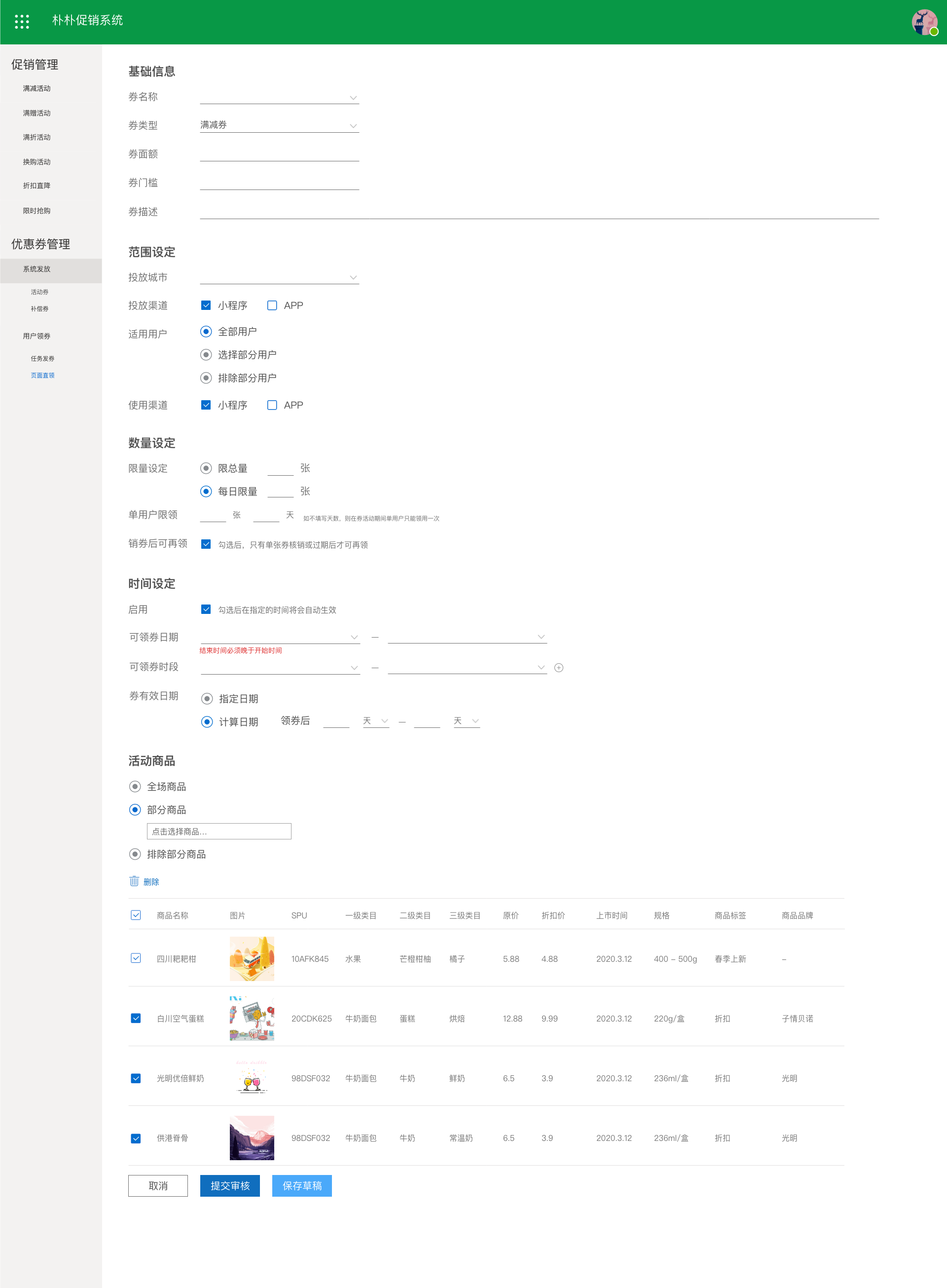 新建优惠券时按照 5W2H 的考量大致划分了字段信息来区分,这里没有考虑重叠互斥的问题,因为朴朴当前的业务逻辑是不论什么类型的优惠券,每单仅限 1 张,与所有促销活动可重叠,计算权重自然是在最后。