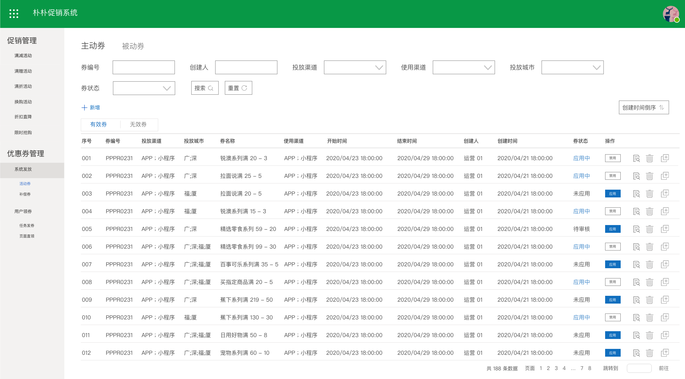 这里维护的是固定业务模式的优惠券和优惠券池,也就是说常见的每日领券、下单返券、客服发券等,可以在这里维护,如果是涉及到关联券的活动,应在另一平台(暂称活动平台)维护,在活动平台可以设定具体的比如 H5 页面内容样式,页面有效时间,页面分享样式等内容,只需复制优惠券系统的券编号,即可关联此处设置的优惠券。