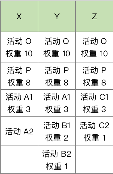 假设有三种产品 X Y Z,各自有图上所示的活动和权重。表格中的 O P 两种活动是与 ABC 活动可叠加的,O 与 P 互斥,A B C 之间互斥。此时 O 权重 高于 P,对于 X Y 而言 A1 权重最高,Z 而言 C1 权重最高。