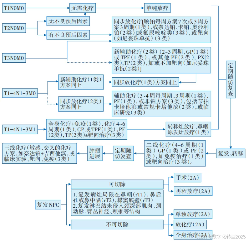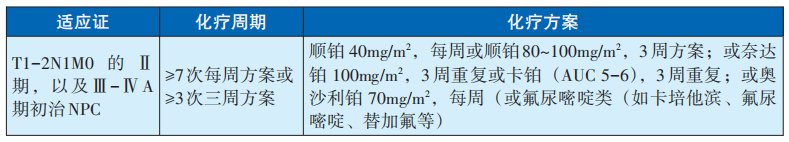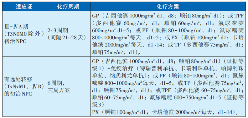 T1N0M0和T2N0M0且无不良预后因素(瘤体大,EBV-DNA表达高)早期NPC不需化疗。T1-2N1M0Ⅱ期,以及Ⅲ-ⅣA期初治局部晚期NPC,在放疗同时给予铂类为主的周方案或三周方案化疗。Ⅲ-ⅣA期(T3N0M0除外)初治 NPC,应予2~3周期(至少2周期) 铂类为基础的新辅助化疗+同步放化疗。仅接受同步放化疗的Ⅲ-ⅣA期(T3N0M0除外)NPC,应在其后行每3~4周一周期,共3周期的辅助化疗。初治远处转移NPC,以全身化疗为主,建议6周期GP或PF方案(联合PD-1抗体)治疗后,若疗效达到CR或PR,再考虑局部治疗