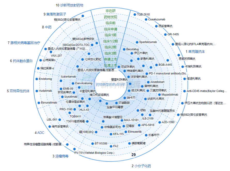 靶点的热点分析,该领域全球研发进度top10的靶点,图中散点代表不同药物。排名前五靶点:PD-1、DNA、PD-L1、EGFR、p53。