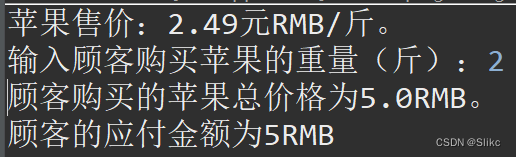 System.out.println("顾客购买的苹果总价格为"+d+"RMB。");//输出信息