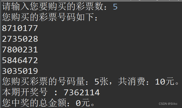 System.out.println("您购买彩票的号码量:" + counts + "张,共消费:" + useMoney + "元。");// 输出结果
