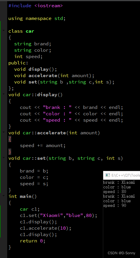 - 创建一个Car类,包含以下成员: 品牌(brand):字符串类型 ,颜色(color):字符串类型 ,速度(speed):整数类型;实现以下成员函数: void display():用于显示汽车的品牌、颜色和速度。 void accelerate(int amount):用于加速汽车,速度增加指定的量,void set(string b,string c,int s):用于给私有属性赋值。在main函数中,创建一个汽车对象,初始化它的信息,并展示其信息。然后,加速该汽车一次,并展示加速后的速度。