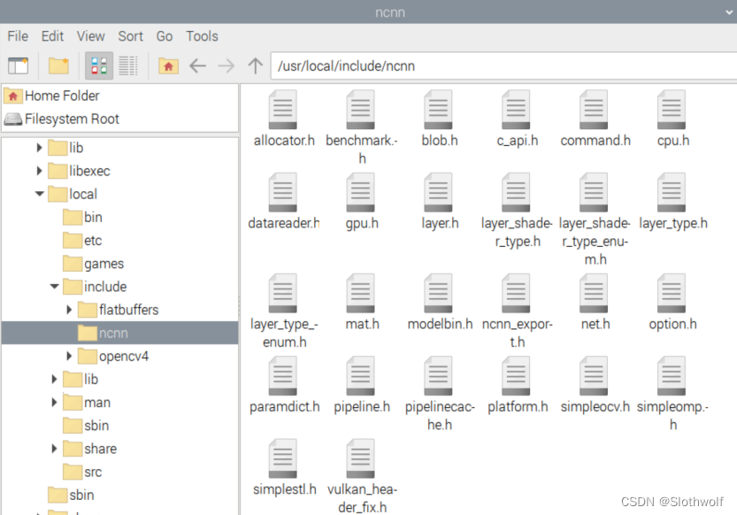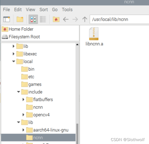 如果一切顺利的话,/usr/local/include中会有一个全是头文件的ncnn文件夹,而/usr/local/lib中也会有一个ncnn文件夹,里面是libncnn.a: