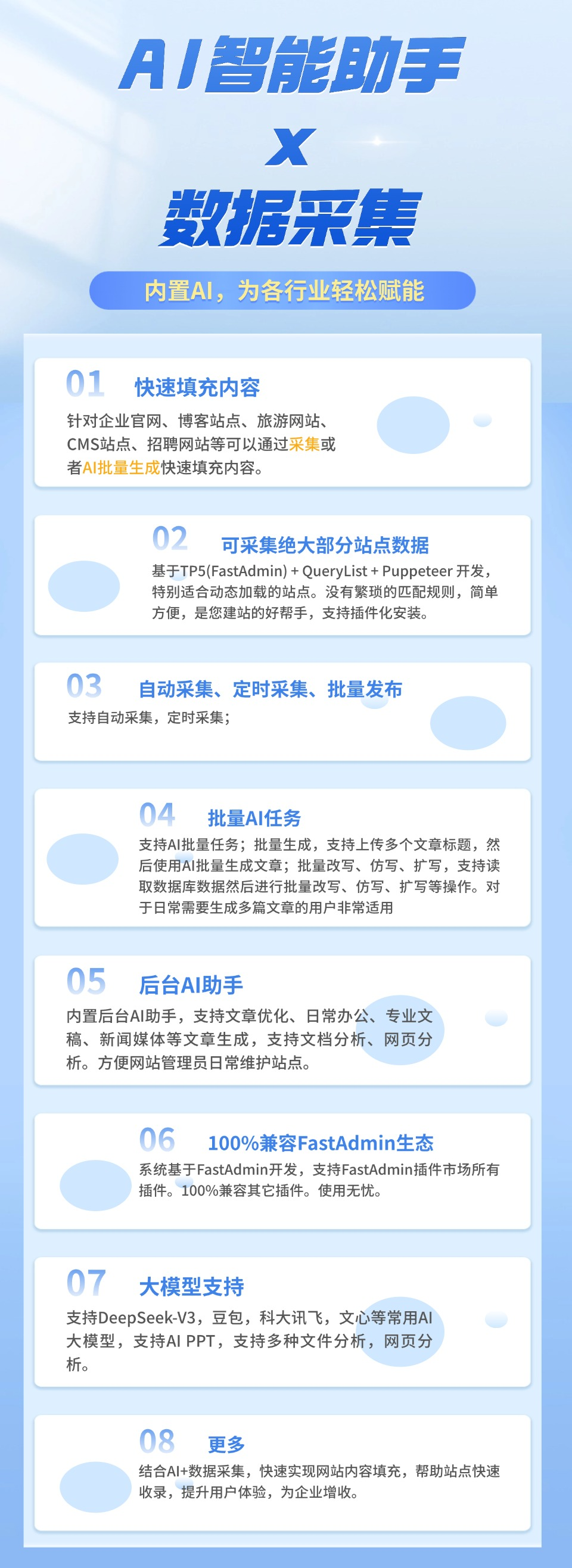 FastAdmin CMS作为一款高效、灵活的企业级内容管理系统,近年来不断融合前沿技术,特别是在AI写作能力上的深度优化,让“3分钟生成一篇原创文章”成为现实。系统内置智能语义分析引擎,可根据企业行业属性、关键词布局和用户搜索习惯,自动生成符合SEO标准的文章。无论是产品介绍、新闻动态还是行业资讯,只需输入主题或关键词,AI即可在短时间内输出结构完整、语言流畅的内容,大幅提升内容更新频率与质量。