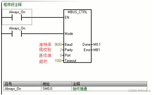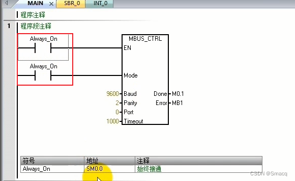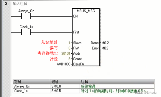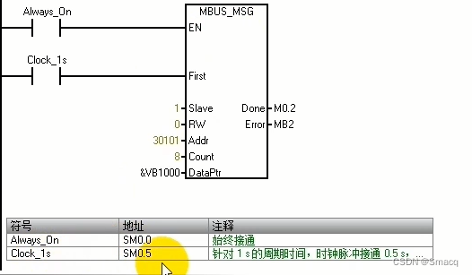 SM0.5表示提供一个周期为1秒钟的时钟脉冲,0.5秒为1,0.5秒为0,与它连接的参数First我们之后说明。