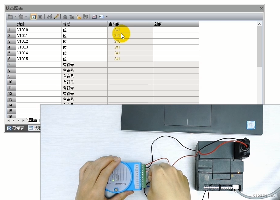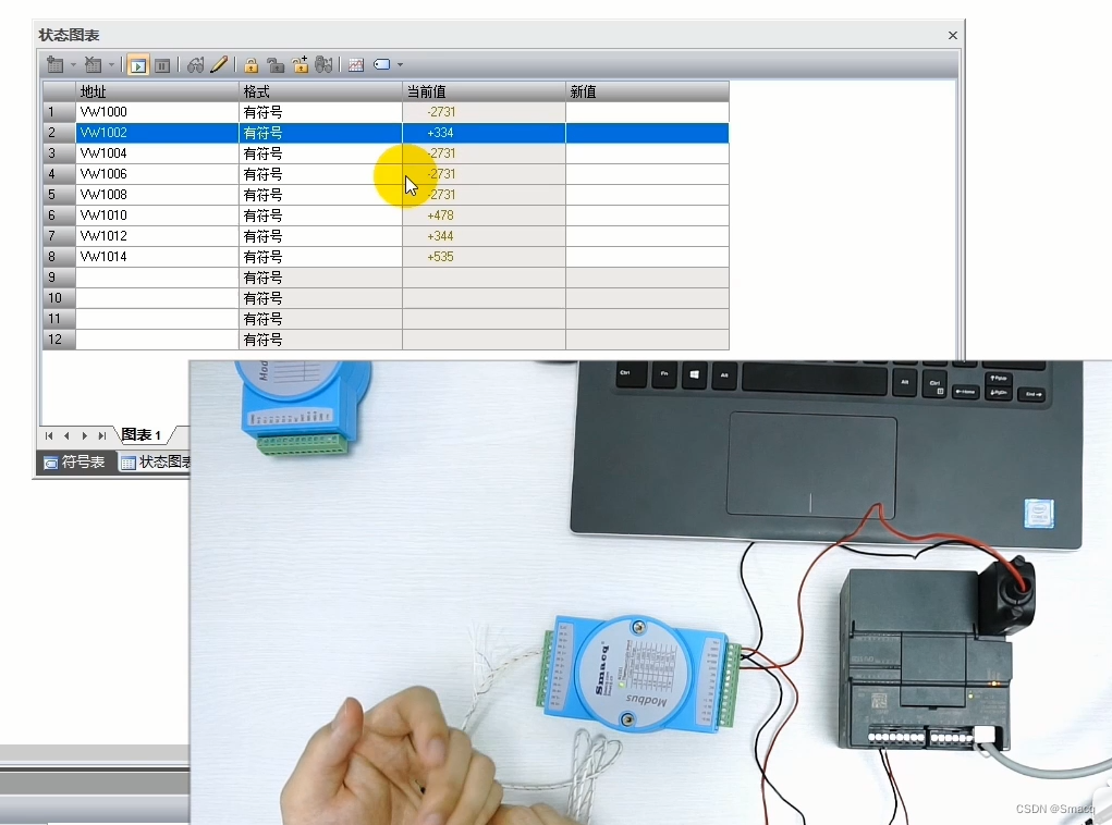如我们现在打开的这个范例程序,它是要操作从热电偶输入寄存器30101到30108这8个寄存器,所以对Count的输入值为8。参数“DataPtr”是间接地址指针,指向CPU中与读/写请求相关的数据的V存储器,指针必须是VB类型。这里的V、VB、VW是V存储器中不同类型数据的表达方式:V表示位数据,VB表示字节数据,VW表示字数据,一个字由两个字节构成,一个字节则有8位。在范例程序中,我们使用VB数据类型存储从模块读到的值,然后用VW数据类型表示出来。进行这样的数据操作是因为,当PLC发出读取请求时,采集模块返回的值是16位的整型数据,需要用两个VB类型的数据表示,而一个VW数据类型就表示两个字节,刚好可以表示模块返回的数据。我们可以在状态图表中验证一下。调出图表窗口,下载程序,运行CPU,开启图表的监视状态,因为我们只为模块连接了一个温度传感器,所以在状态图表中只有第2行显示出实际温度值,当我们提高环境温度,第2行的当前值也会随之改变。其它没有接入温度传感器的端口,其寄存器的返回值是-2731。