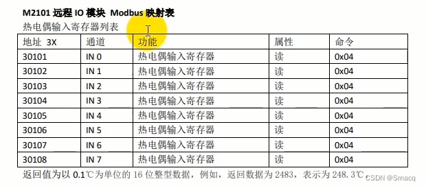 打开范例M2100的用户手册,找到M2101远程IO模块Modbus映射表就可以看到地址、通道、属性等内容。