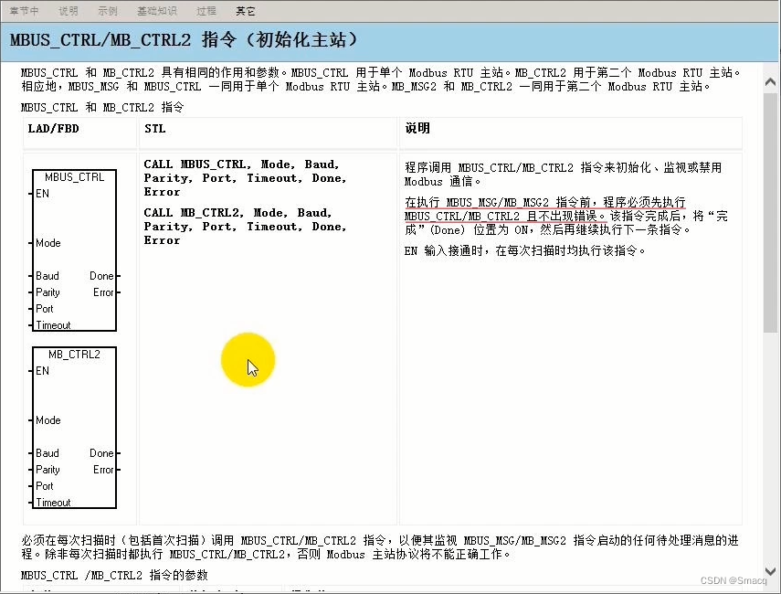 特殊寄存器(SM)的其它地址位,大家可以到在线帮助文档中查看。指令MBUS_CTRL,可以在主要窗口的库文件中的Modbus RTU Master(v2.0)中找到,右键选择帮助就可以看到它的说明文档。需要声明的是:在程序中,我们将PLC当作主站,M模块(如:M-2101)则作为从站使用。阅读说明内容我们知道MBUS_CTRL是程序在执行MBUS_MSG指令前必须调用的指令。