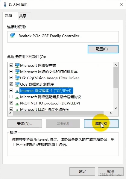 在弹出的窗口中找到Internet协议版本4(TCP/IPv4)项目,点击属性。