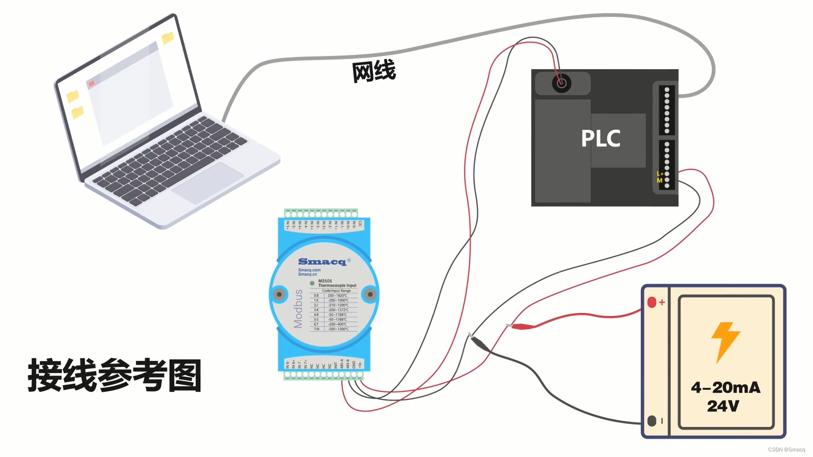 我们首先说明各设备是如何连接的,将直流电源连接到PLC的24V电源接口,正极接L+,负极接M。因为RS485端口是集成在PLC的九针超小D型连接器上的,所以我们制作了一个连接器方便设备接线。具体的针脚分配,大家可以在STEP 7 SMART软件的在线帮助文档中的连接器引脚分配章节中看到。连接器的红线接M2101模块的485-A信号,黑线接485-B信号。因为用以太网电缆连接PLC和电脑,所以需要调整电脑的IP地址,它的具体操作我们之后说明,现在只要将电缆插入网口即可。此次实验我们依然使用SDS-1001为采集模块供电,将它们的+Vs、GND端连接就可以了。最后将K型热电偶接入M2101模块中的DI 1端口。为模块通电,这样设备接线就完成了。