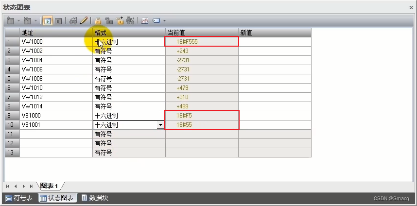 接着验证我们刚才提到的V存储器的数据类型,在状态图表中输入VB1000,按回车键,就可以按顺序添加地址。将它们的格式更改为十六进制,VB1000为F5,VB1001为55,而VW1000是它俩的集合F555。所以说两个VB数据类型,构成一个VW数据类型。