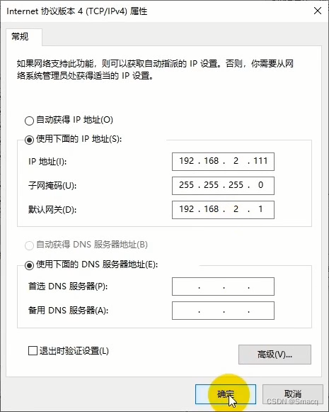 选择使用下面的IP地址,输入相应的IP地址:192.168.2.111,子网掩码输入225.225.225.0,默认网关是:192.168.2.1。点击确定。