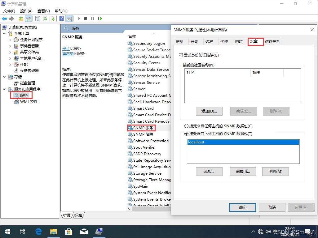 5.此电脑→ 右键→ ”管理“ →”服务“ → SNMP 服务