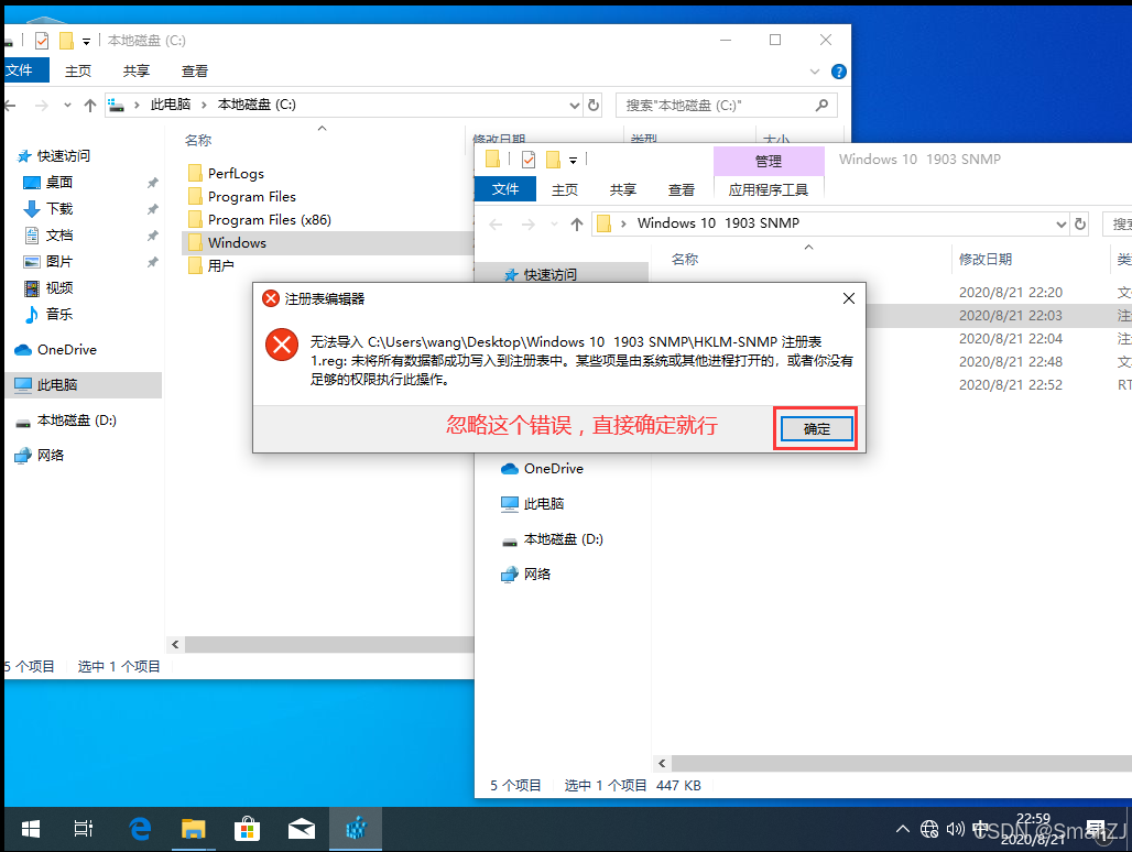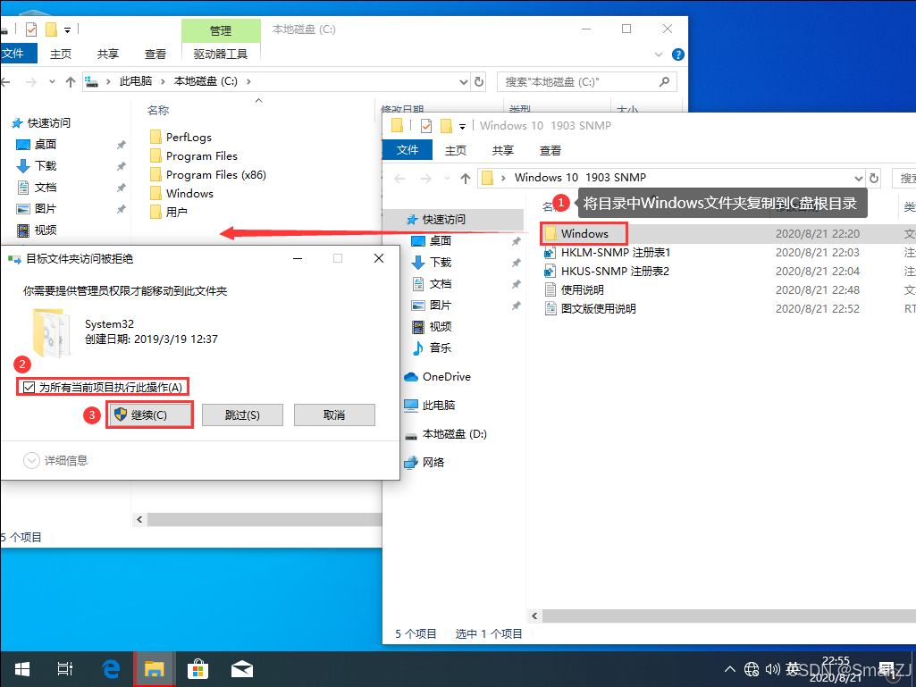 2.将Windows 10 1903 SNMP本文件夹内的 Windows目录拖入到 C盘根目录并覆盖