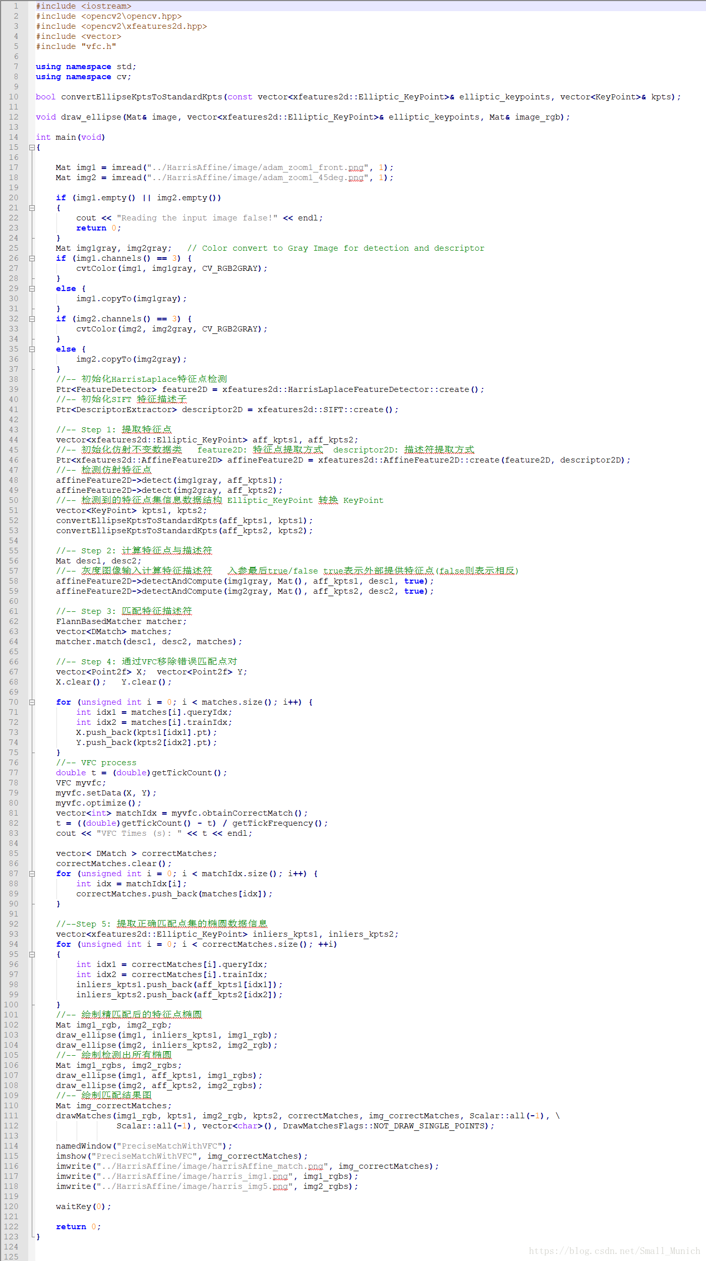 主程序部分: 特征点检测部分采取HarrisLaplace检测,然后进行仿射迭代求取稳定仿射不变点,对局部区域进行SIFT描述符构建,匹配阶段首先采取FLANN进行粗匹配,随后采取(向量场)VFC进行精确点提纯。