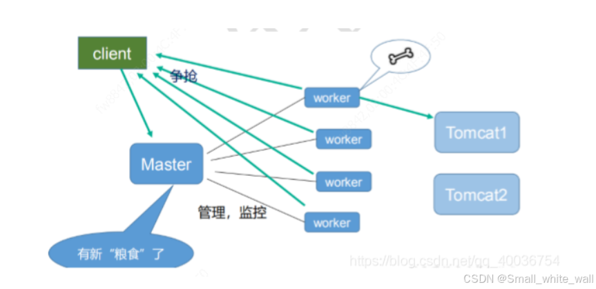 过来的请求由master管理,worker进行争抢式的方式去获取请求。