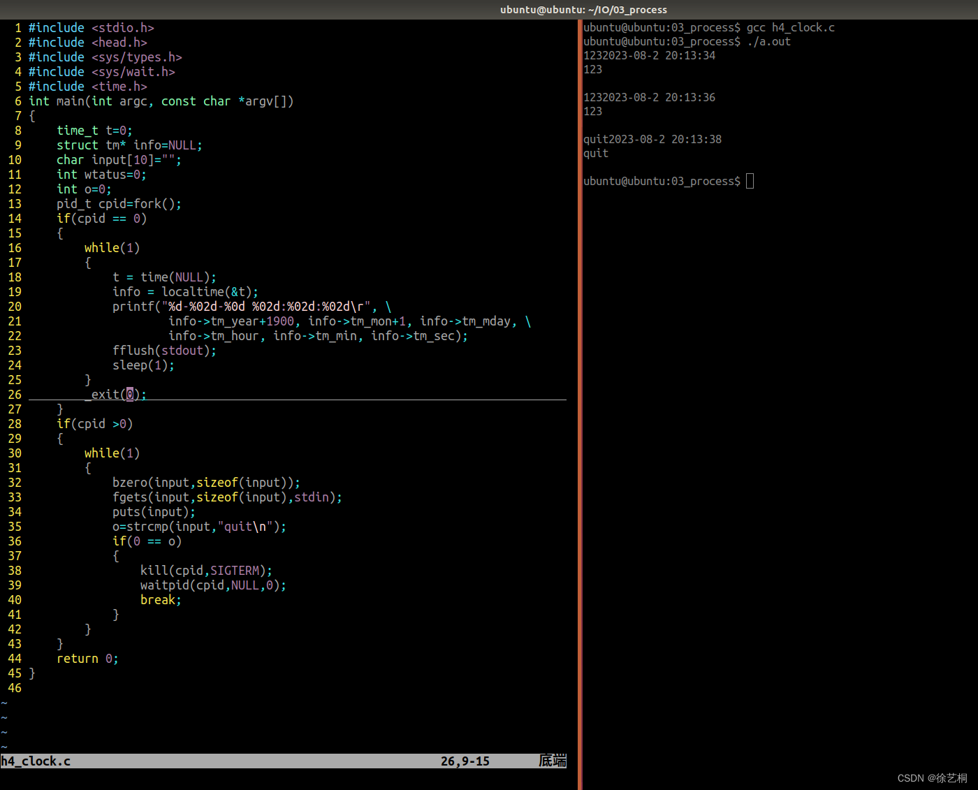 作业2:打印时钟在终端上,若终端输入quit,结束时钟