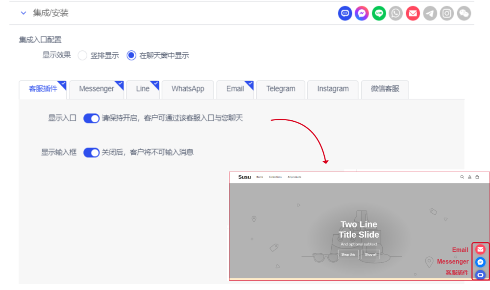 ·在引流部件部分,你可以选择在网页中显示多个聊天挂件,包括客服插件、Messenger、Line、WhatsApp、Email等。