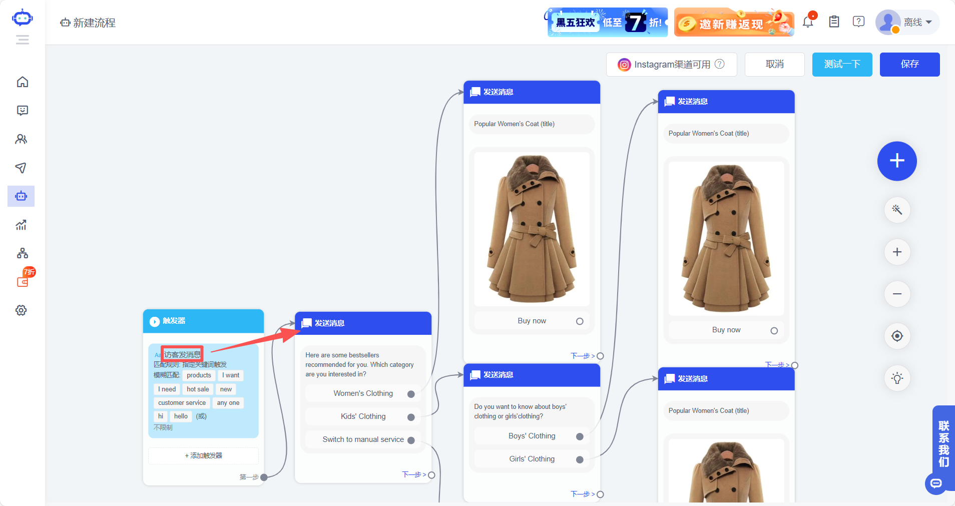 用户咨询商品 → 系统可以执行“自动回复商品信息”或“独立站的下单链接”的动作