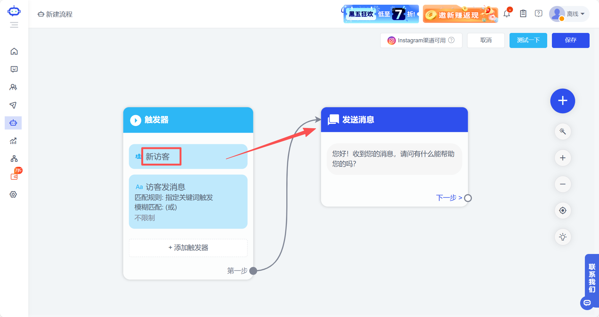 用户是新访客,首次发送私信给商家 → 可以添加“自动对用户发送欢迎语”的自动化流程