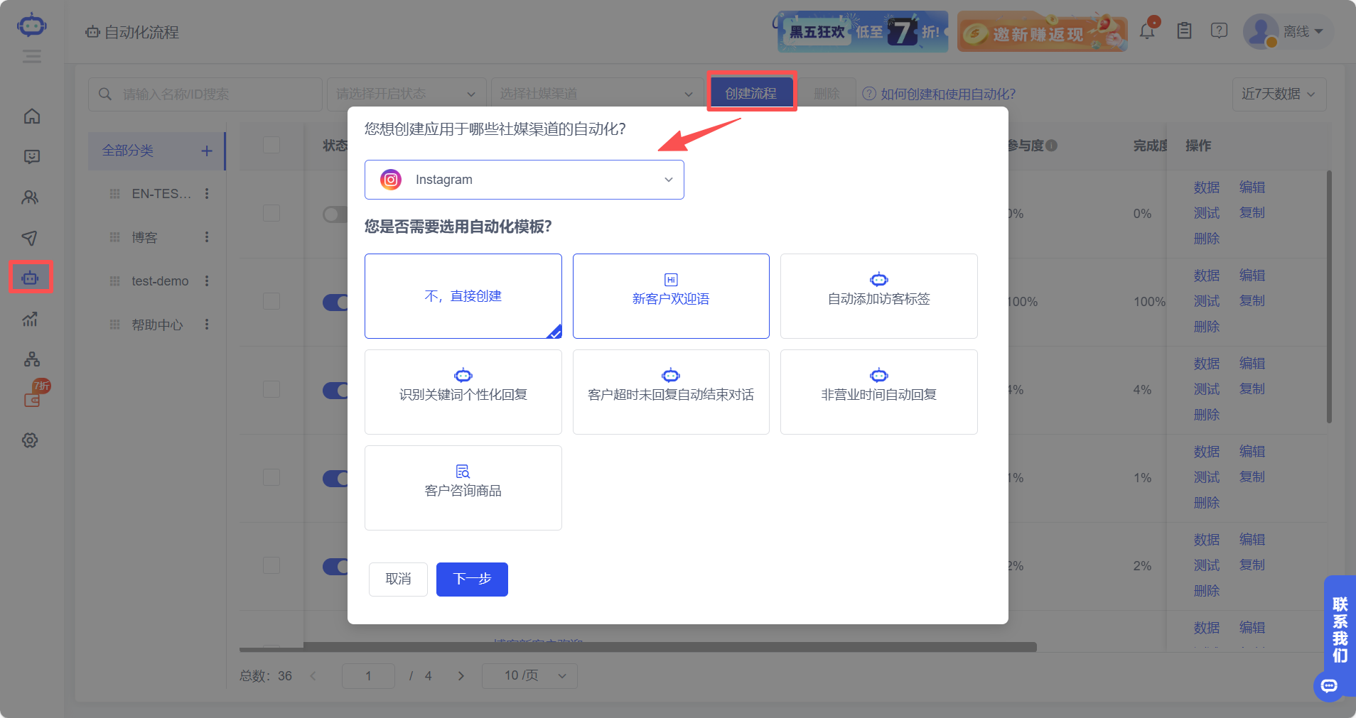 把企业的 Instagram 账号集成到 SaleSmartly 平台之后,点击【机器人】-【自动化流程】-【创建流程】- 选择 Instagram 平台;创建完成之后,客户可以根据需求设置触发器、条件和动作,从而更精准地回复用户消息。
