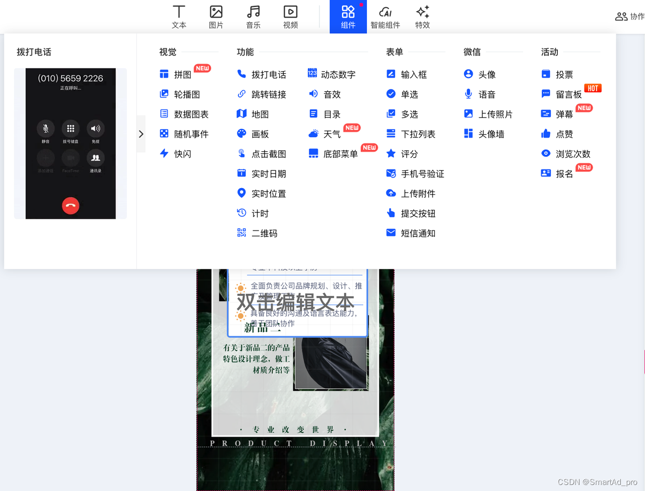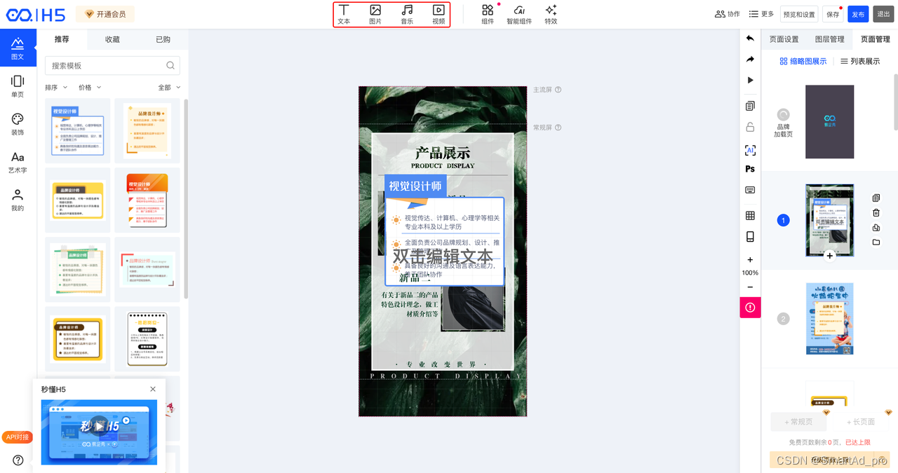 1.场景编辑器非常强大,支持文本、图片、音乐、视频、图集等富媒体材质的编辑和设计,页面设计具有很高的自由度,所见即所得的效果。