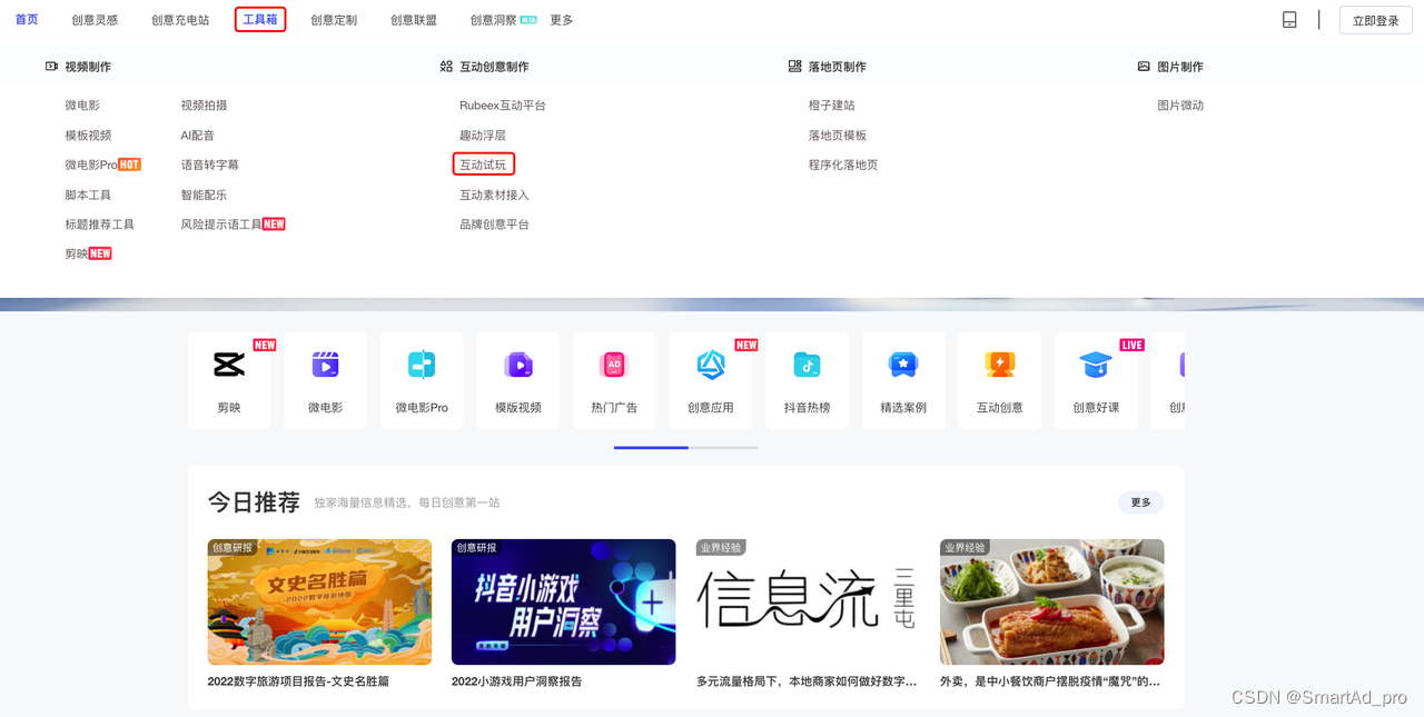 第一个试玩广告素材平台是字节旗下的“巨量创意”,其中互动试玩广告板块为用户提供创意生产工具矩阵,涵盖视频、图片、文案、落地页等全场景创意元素,提升创意制作效率,助力广告创意投放。