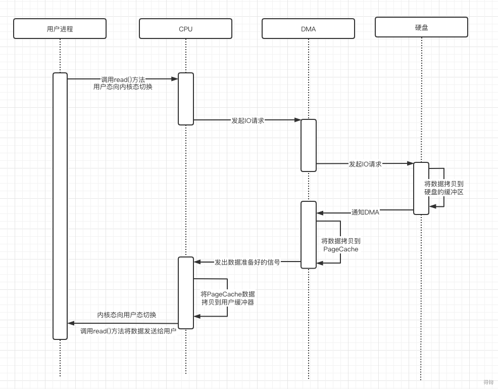 通常我们需要访问硬盘数据的时候,用户进程需要借助内核来访问硬盘的数据;用户通过调用系统方法,如 read()、write()等方法通知内核,让内核做相应的事情。