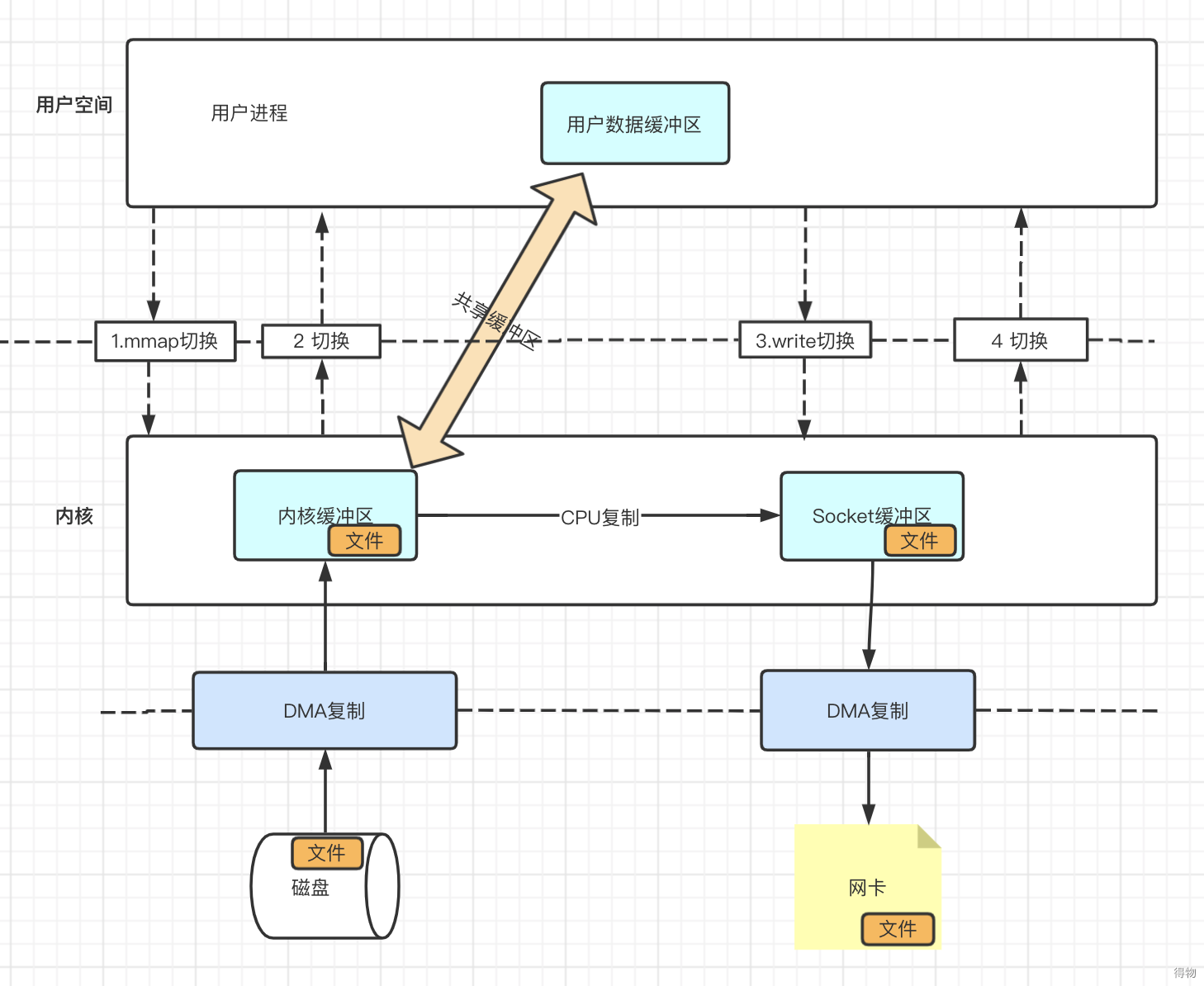用户进程调用系统函数 mmap()后,DMA 会将数据从磁盘拷贝到内核缓冲区中,用户进程与内核缓冲区共享这块内存数据;
