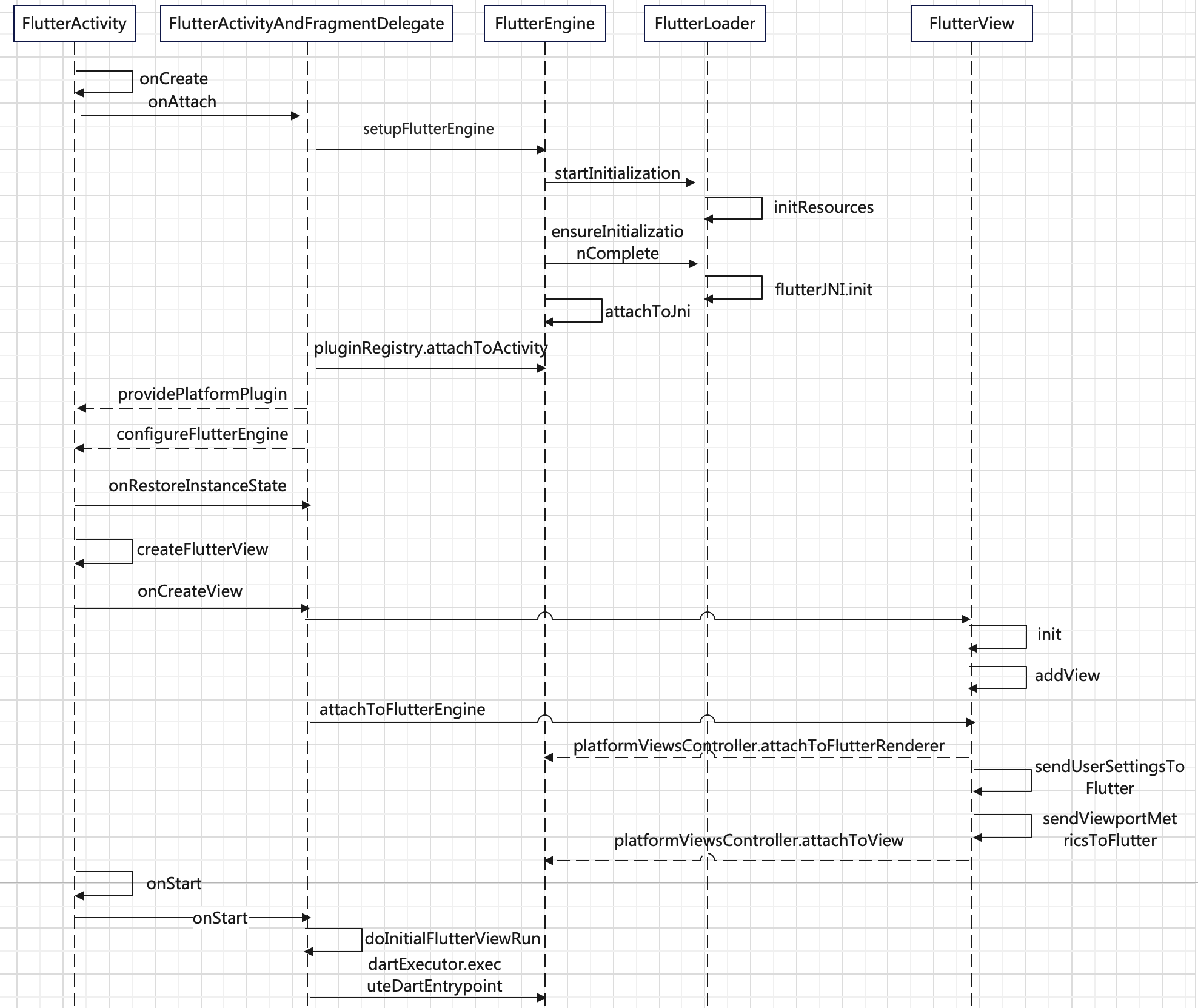 Android以FlutterActivity/FlutterFragment/FlutterView的形式承载flutter界面。当我们使用AndroidStudio创建一个新的flutter工程时,生成的MainActivity是直接继承了FlutterActivity,那么很明显,主要的逻辑都在这个FlutterActivity里面了。从流程图看到,flutter的启动流程也是从FlutterActivity的onCreate方法开始的: