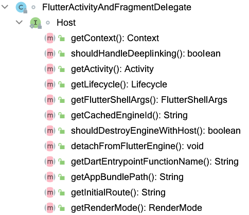 FlutterActivity也是继承的Activity,但是它把主要的功能都委托给了FlutterActivityAndFragmentDelegate类去实现,实现的Host接口主要是支持在delegate中获取FlutterActivity的一些参数,比如configureFlutterEngine,这些方法可以由子类去重写,实现自定义配置。