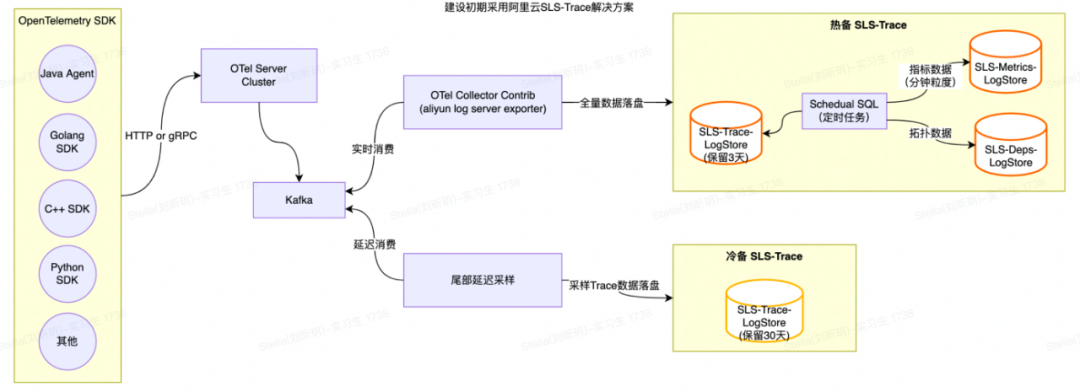 - 利用OpenTelemetry Collector aliyunlogserverexporter【2】将Trace数据写入到SLS-Trace Logstore中;