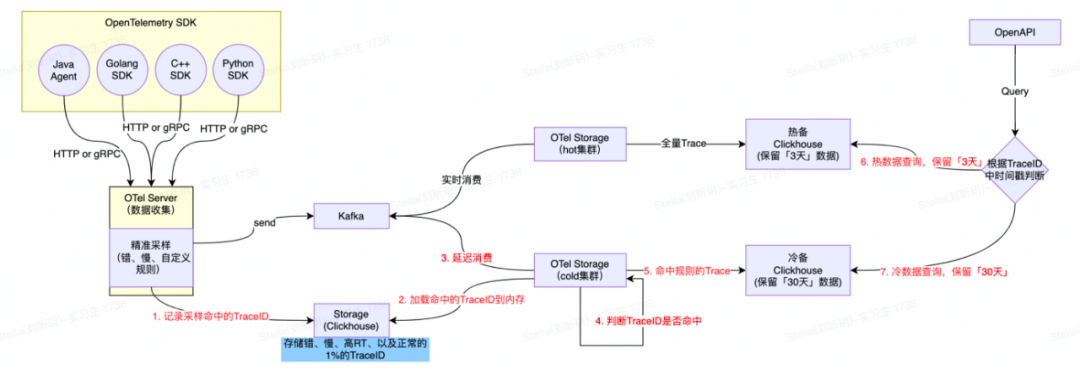 - 基于Kafka延迟消费+Bloom Filter尾部采样的数据(错、慢、自定义采样规则、以及默认常规0.1%采样数据)保留「30天」,定义为冷数据。