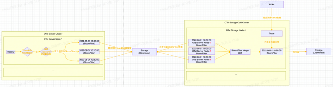- OTel Storage持久化冷数据:订阅上游OTel Server的Bloom Filter,延迟消费Kafka中的数据,将TraceID在Bloom Filter中可能存在的Span数据持久化到ClickHouse冷集群中;延迟时间配置的30分钟,尽量保证一个Trace下的Span完整保留。