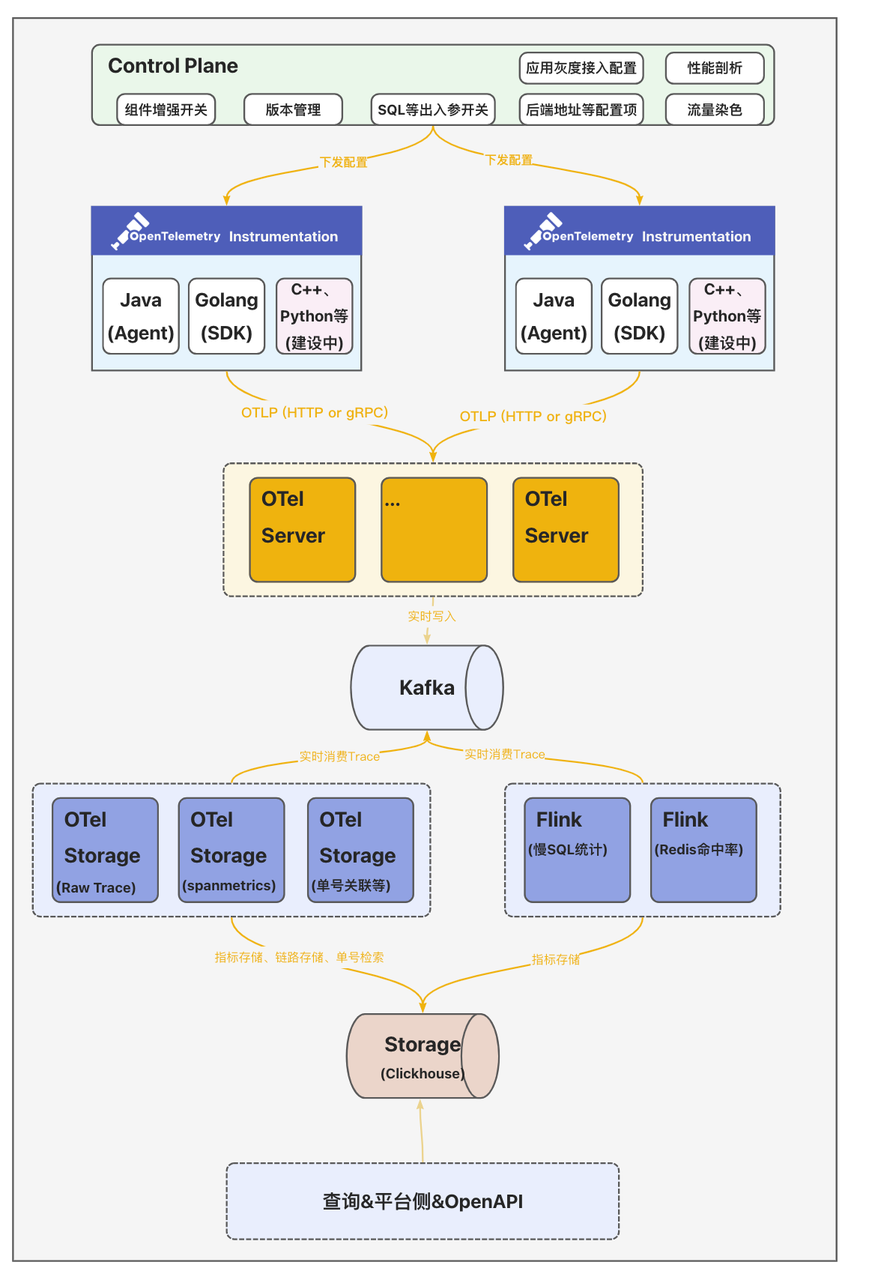 - 控制平面Control Plane:统一的配置中心向数据采集侧下发各类动态配置发并实时生效;支持向各采集器下发动态配置并实时生效,支持应用按实例数灰度接入,并提供出入参收集动态开关、性能剖析动态开关、流量染色动态配置、客户端版本管理等。