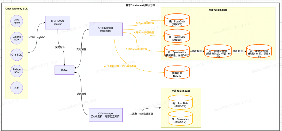 - OTel Storage持久化热数据:实时消费Kafka中数据,并全量持久化到ClickHouse热集群中;