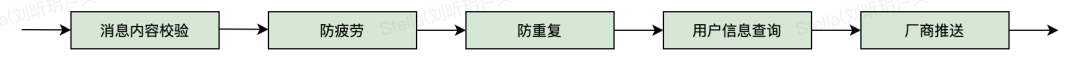 得物消息中心主要承接上游各业务的消息推送请求,如营销推送、商品推广、订单信息等。消息中心接受业务请求后,会根据业务需求去执行【消息内容检验,防疲劳,防重复,用户信息查询,厂商推送】等节点,最后再通过各手机厂商及得物自研的在线推送通道触达用户。整体推送流程简化如下: