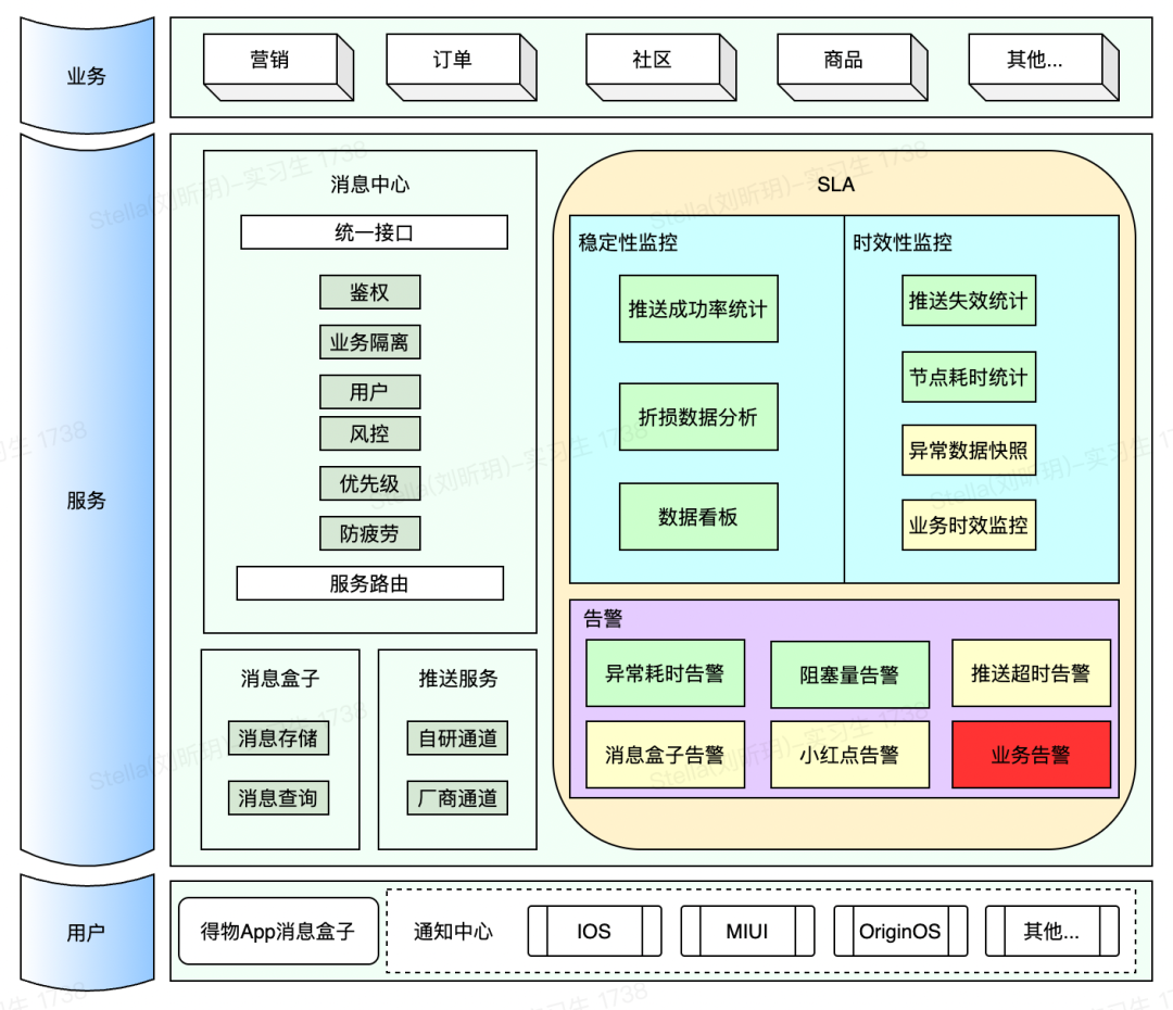得物消息中心每天推送数亿消息给得物用户,每天引导数百万的有效用户点击,为得物App提供了强大,高效且低成本的用户触达渠道。这么庞大的系统,如何去监控系统的稳定性,保证故障尽早发现,及时响应至关重要。为此,我们搭建了得物消息中心SLA体系,相关架构如图: