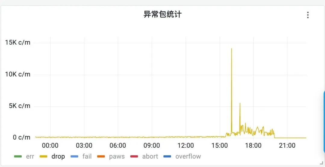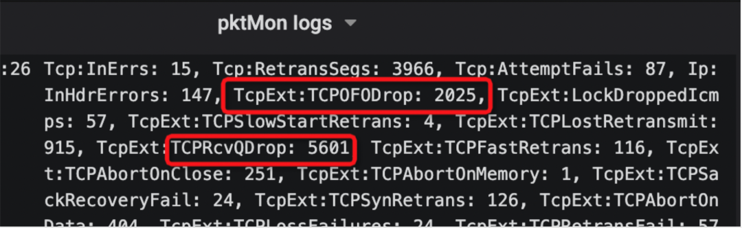 node监控有大量的异常包,drop 计数异常,常规情况下应该为0(上图),我们对这些drop 包做了分析(下图)发现Drop 的统计数非常高,同时tcpofo,tcprcvq这两个指标指向了TCP内存限制,需要扩充内存空间。