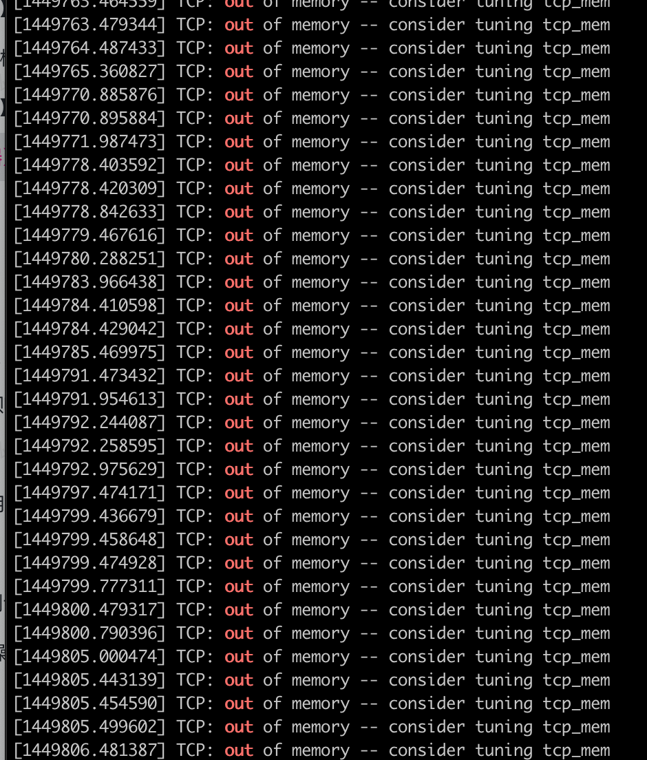 另外当时我们也发现了dmesg日志里tcp oom的日志,如下图所示